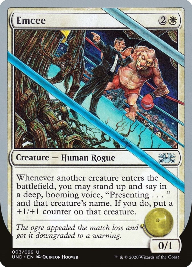 Whenever another creature enters the battlefield, you may stand up and say in a deep, booming voice "Presenting . . ." and that creature's name. If you do, put a +1/+1 counter on that creature.