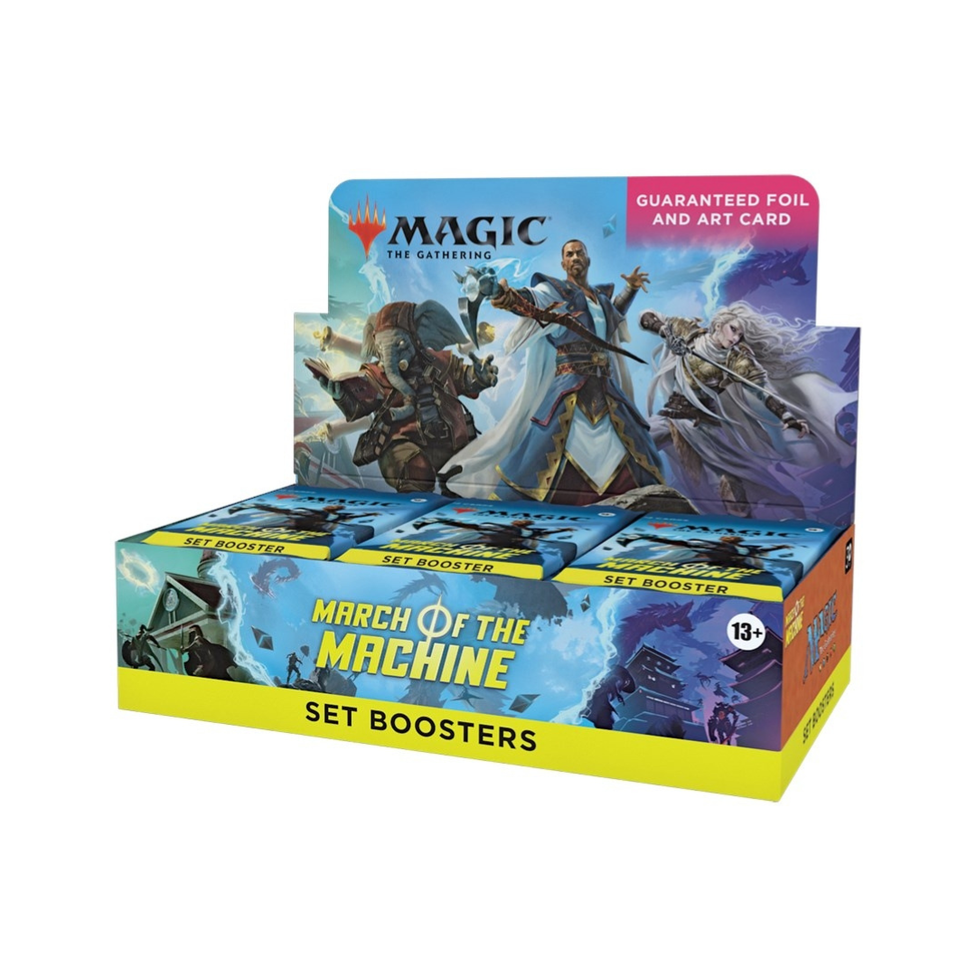 Rules Text Contains: The March of the Machine Set Booster Box contains 30 March of the Machine Set Boosters. Each Set Booster contains 12 Magic cards, 1 Art Card, and 1 token/ad card, Helper card, or card from “The List” (a special card from Magic's history—found in 25% of packs). Each pack includes a combination of 1-5 card(s) of rarity Rare or higher, and 3-8 Uncommon, 2-7 Common, and 1 Land cards. 1 non-Art Card and non-Land card of any rarity is foil. Traditional Foil Borderless Mythic Planeswalker in <1% of boosters. Foil-Stamped Signature Art Card replaces Art Card in 10% of boosters. Contents: • 30 March of the Machine Set Boosters—the best MTG boosters to open just for fun • 12 Magic: The Gathering cards per booster • 1-5 cards of rarity Rare or higher in each pack • Traditional Foil card and Art Card in every pack • Battle the Machine Legion as Phyrexians invade planes across the Multiverse
